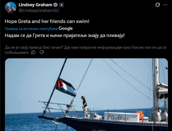 Američki senator Lindzi Grejem izazvao je buru reakcija svojom objavom na mreži X, u kojoj je praktično zapretio švedskoj klimatskoj aktivistkinji Greti Tunberg, koja se nalazi na brodu „Flote slobode“, trenutno na putu ka Gazi sa ciljem da probije izraelsku pomorsku blokadu.