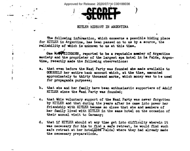 CIA poseduje autopsijski izveštaj koji potvrđuje Hitlerovu smrt, ali drugi dokumenti svedoče o sumnjama terenskih agenata da je možda pobegao u Južnu Ameriku pod lažnim imenom. Jedan od dosijea iz oktobra 1945. navodi da su agenti američkog ratnog sekretarijata informisali FBI o mogućem Hitlerovom skrovištu u spa hotelu u La Faldi u Argentini. Vlasnica hotela i njena porodica bili su „oduševljeni Hitlerovi simpatizeri“ i donirali su novac nacističkoj partiji još 1920-ih preko ministra propagande Jozefa Gebelsa.
