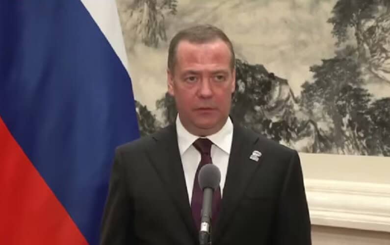 „Hitno treba da preokrene situaciju… i za to su sva sredstva dozvoljena. Sve do udara na sopstvene gradove, na sopstveno civilno stanovništvo ili čak upotrebe oružja za masovno uništenje poput prljave bombe“, rekao je Medvedev.